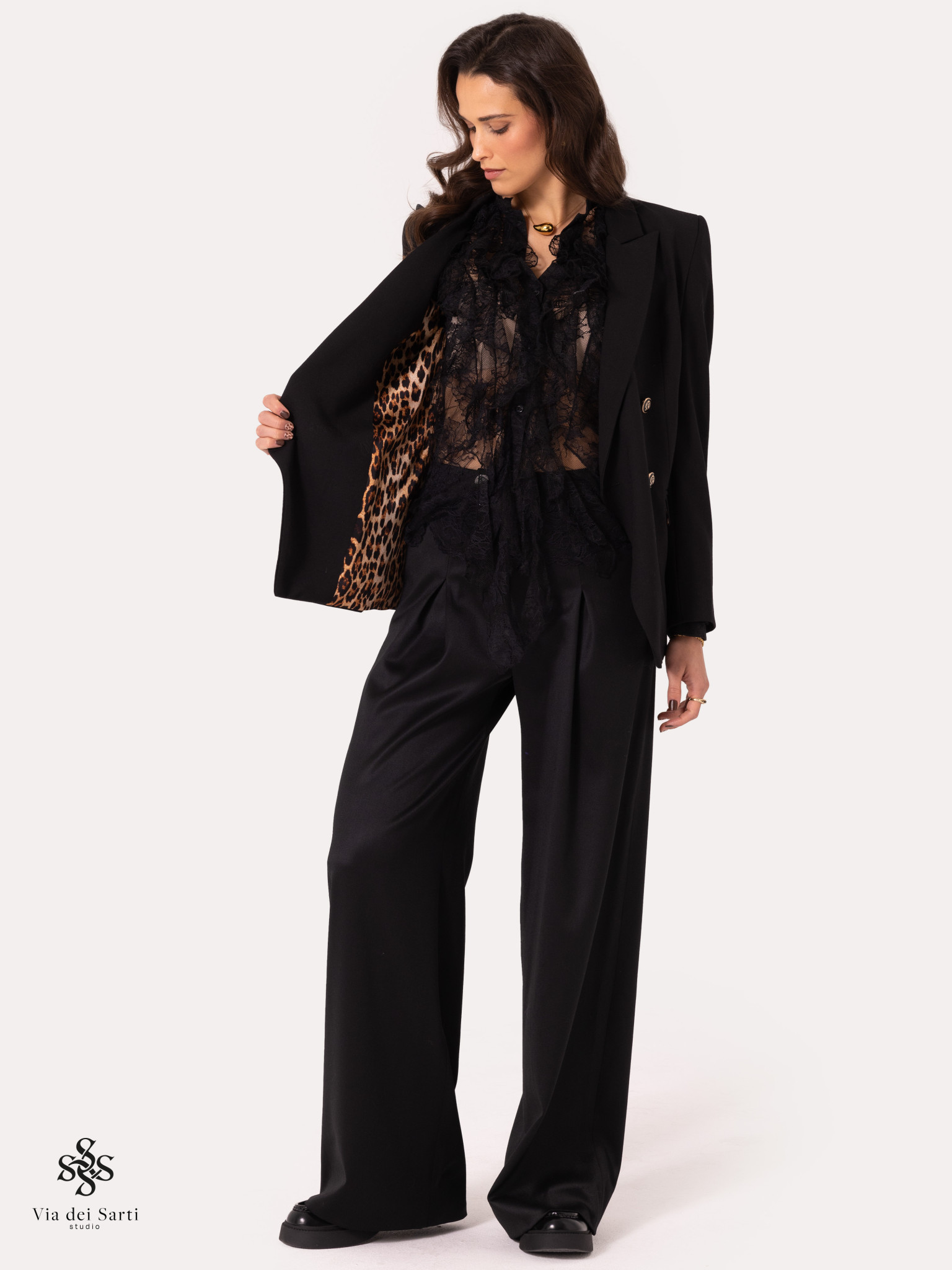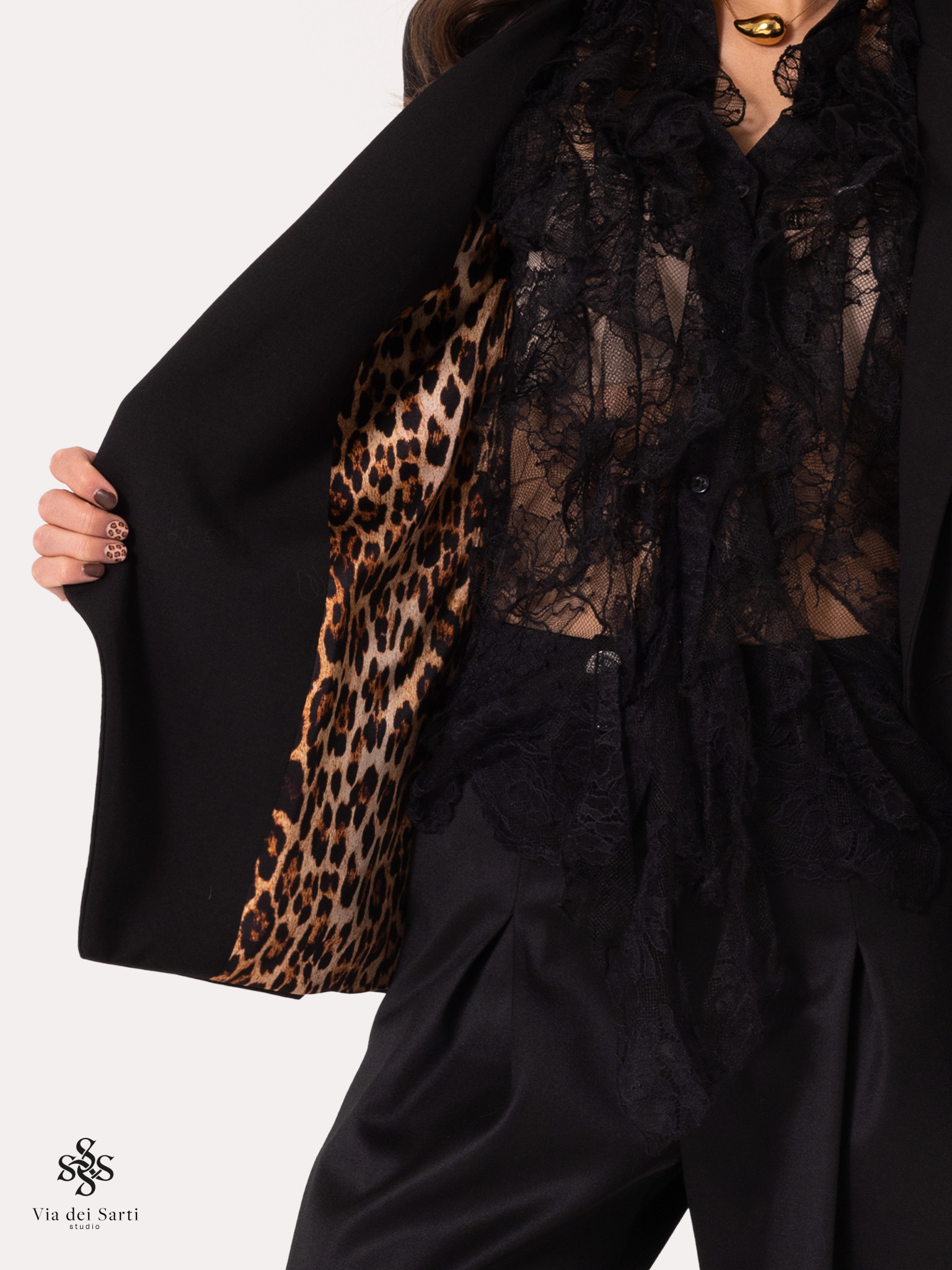 Luksusowy, czarny garnitur wykonany z wysokiej jakości włoskiej wełny w stylu nowoczesnego Quiet Luxury. Marynarka została wykończona spektakularną podszewką z jedwabiu w klasyczny wzór panterki – detal, który dodaje elegancji, pewności siebie i subtelnej zmysłowości.