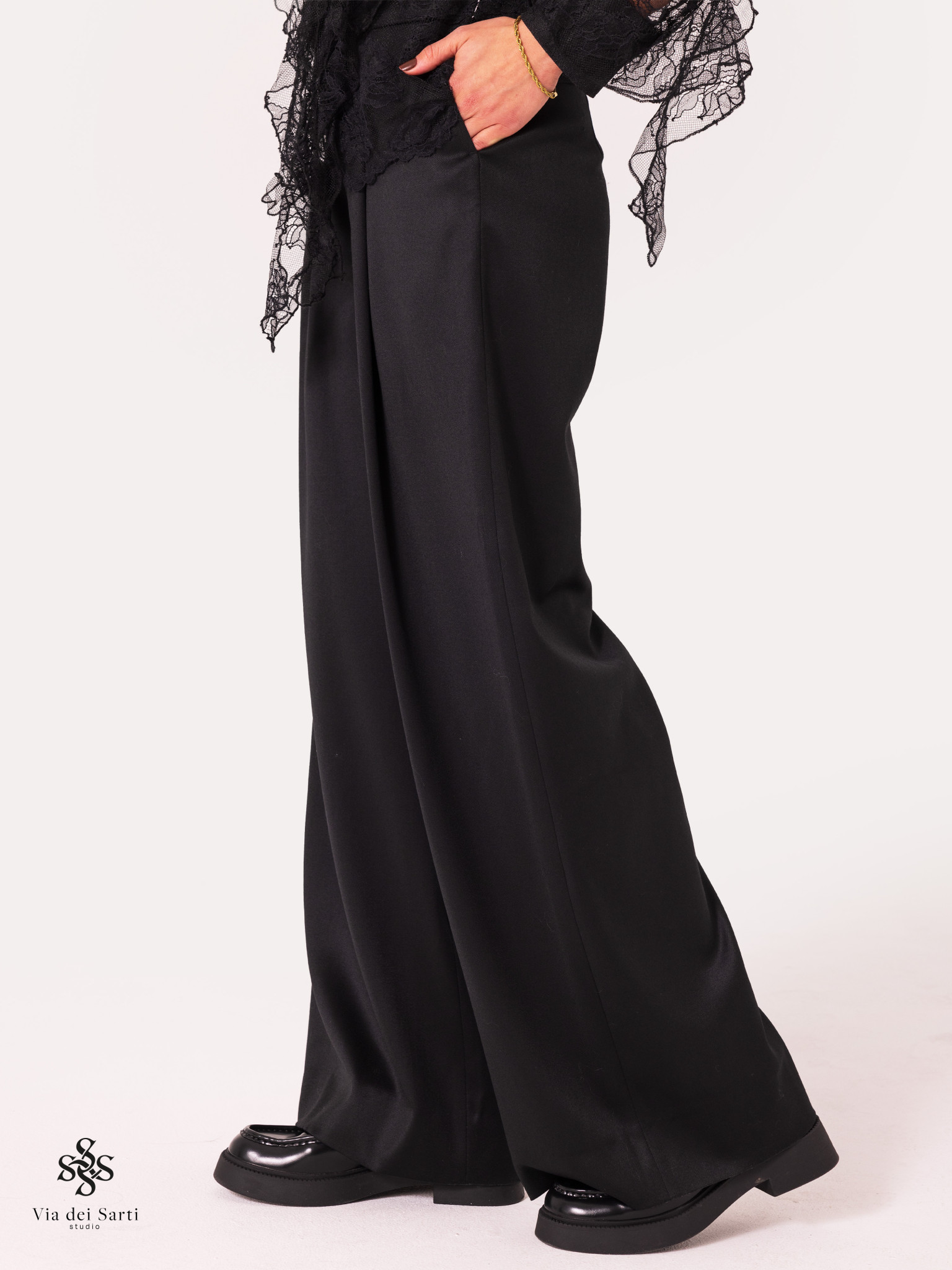 Marynarka ma dopasowany, minimalistyczny krój oraz eleganckie metalowe guziki. Spodnie posiadają luźny krój – z szeroką, miękko układającą się nogawką i charakterystycznym pasem, który podkreśla linię talii.