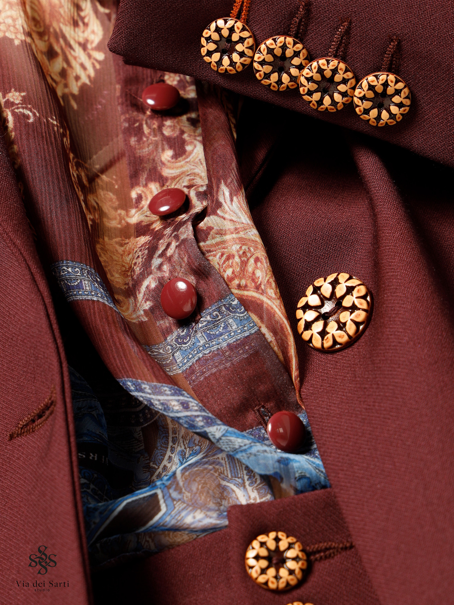Marynarka podszyta podszewką z jedwabiu w artystyczny wzór, ozdobiona dwurzędowo eleganckimi guzikami.