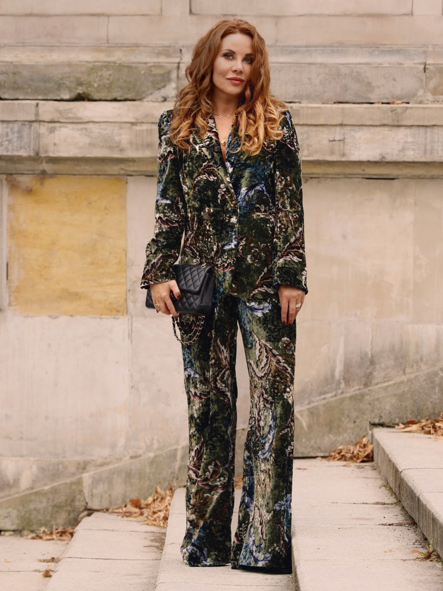 Obok tego garnituru nie da się przejść obojętnie. Luksusowy, niezwykle miękki hiszpański welur stanowi perfekcyjne uzupełnienie zimowej garderoby. Garnitur idealnie sprawdzi się na wieczorne wyjścia i wyjątkowe okazje — zwłaszcza tam, gdzie gra światła podkreśli jego głębię i wyrafinowanie.