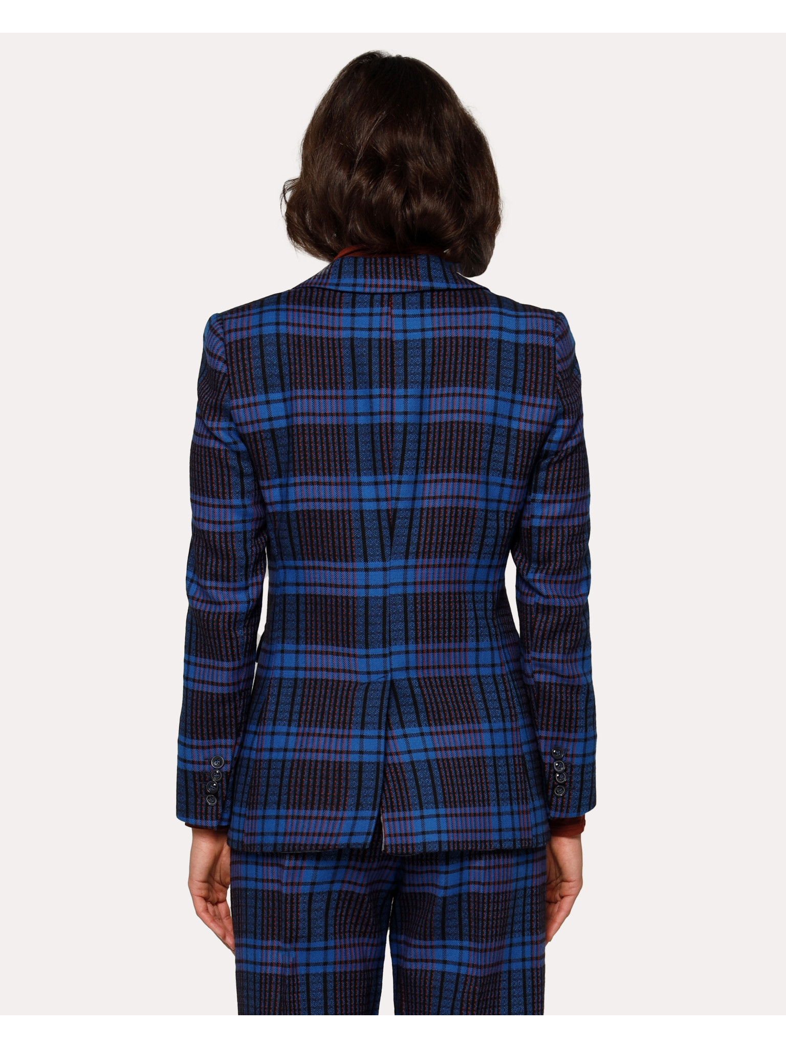 Wyrazista, artystyczna marynarka z włoskiej wełny o lekko plecionej strukturze. Tkanina jest odporna na gniecenie i ma charakterystyczny, energetyczny wzór.