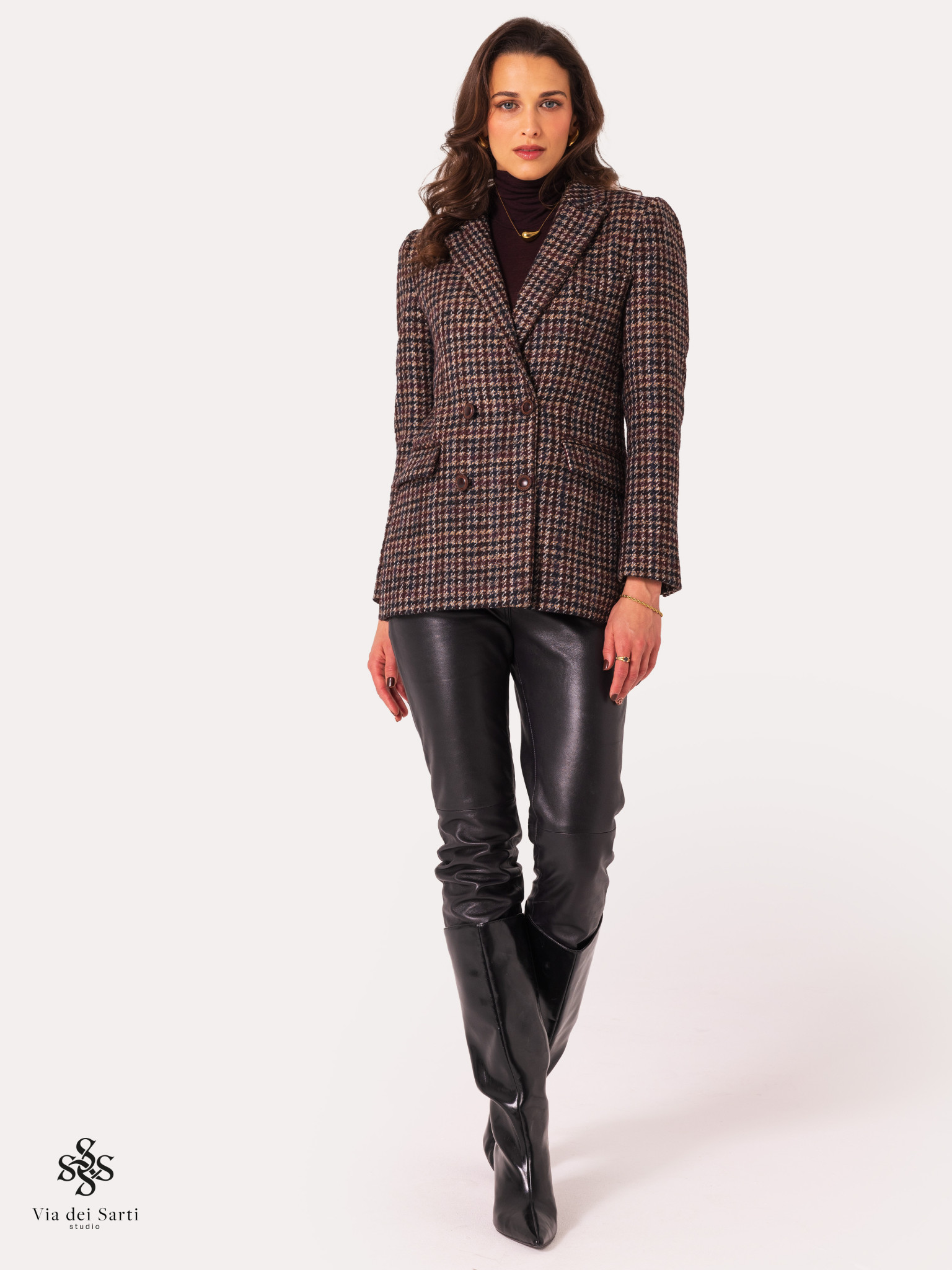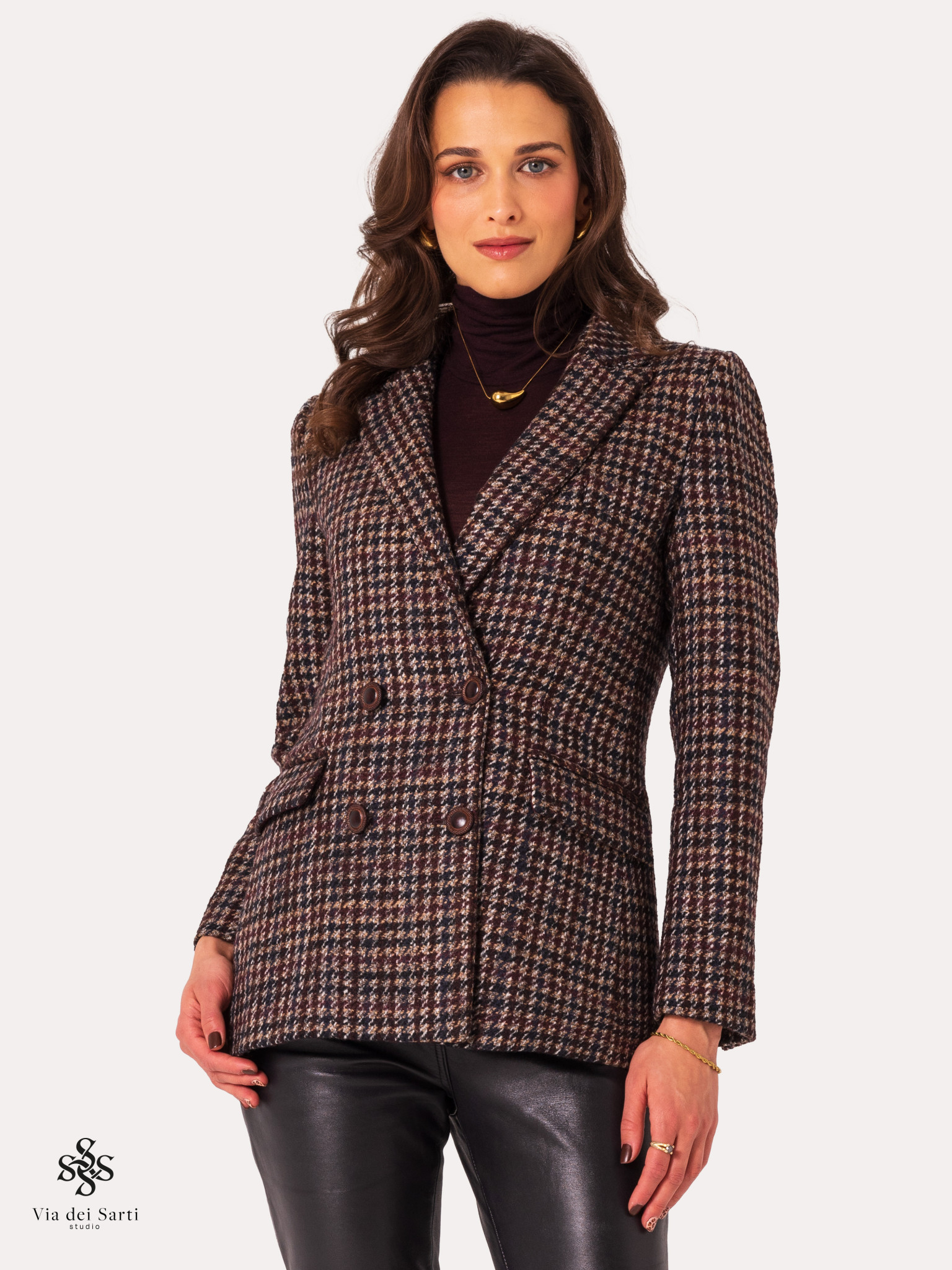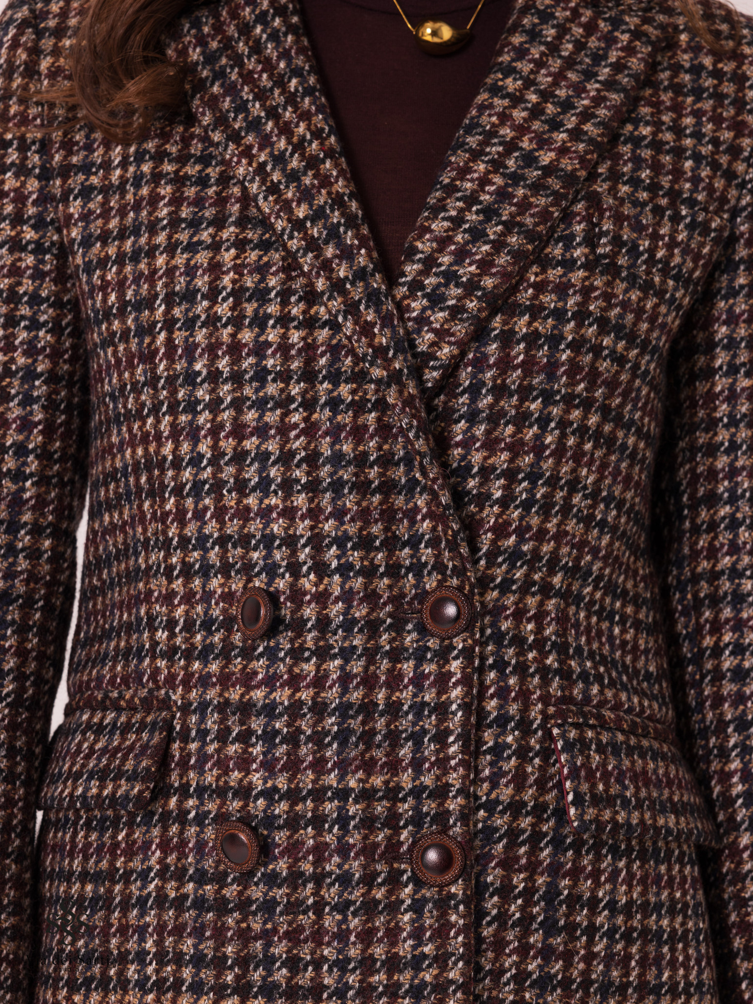 Luksusowa marynarka damska z ciepłej, miękkiej włoskiej wełny w kratę, podszyta podszewką z wiskozy w bardzo modnym kolorze burgunda.