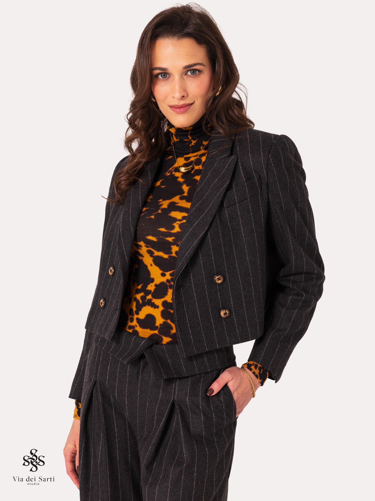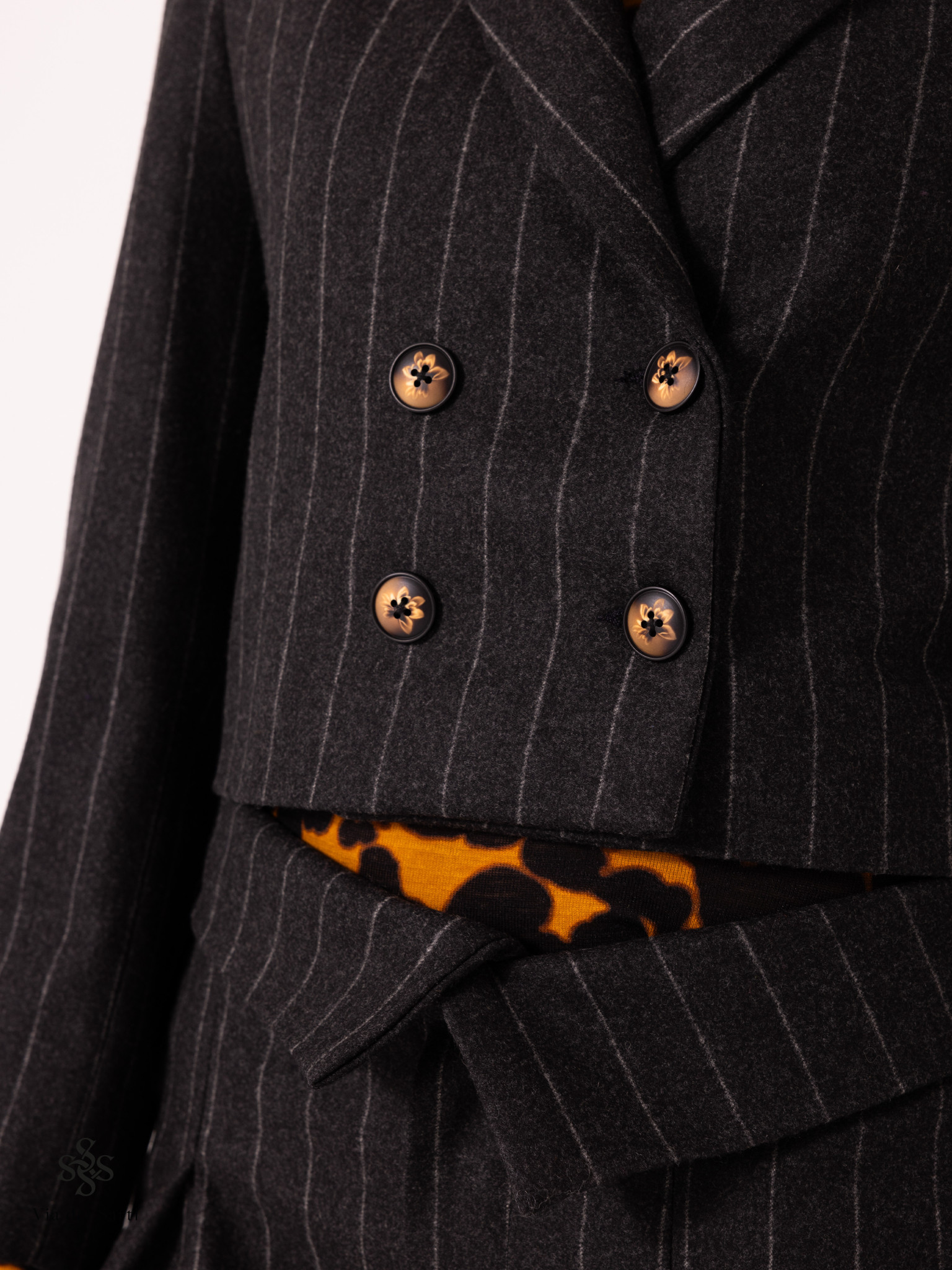 Luksusowy garnitur wykonany z delikatnej, wysokogatunkowej włoskiej wełny w elegancki, cienki prążek. Krótka marynarka o wyrazistym kroju została zaprojektowana z myślą o nowoczesnej, pewnej siebie kobiecie. Ozdobiona czterema guzikami i subtelnymi przeszyciami, pięknie podkreśla linię talii.