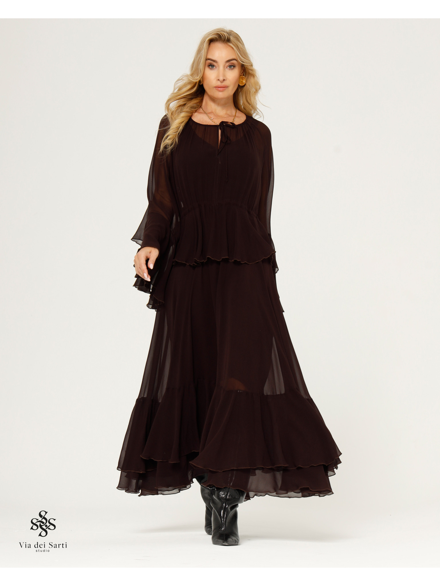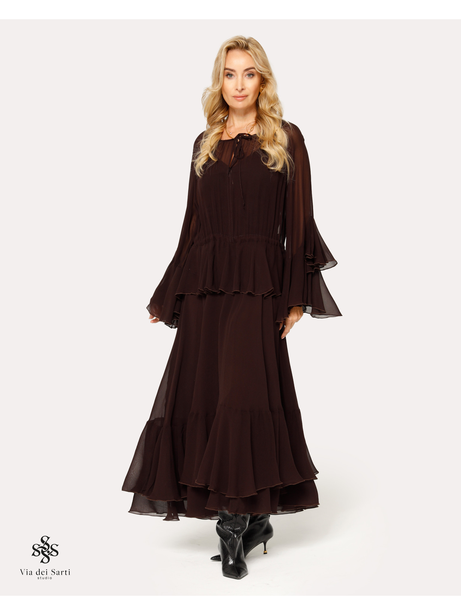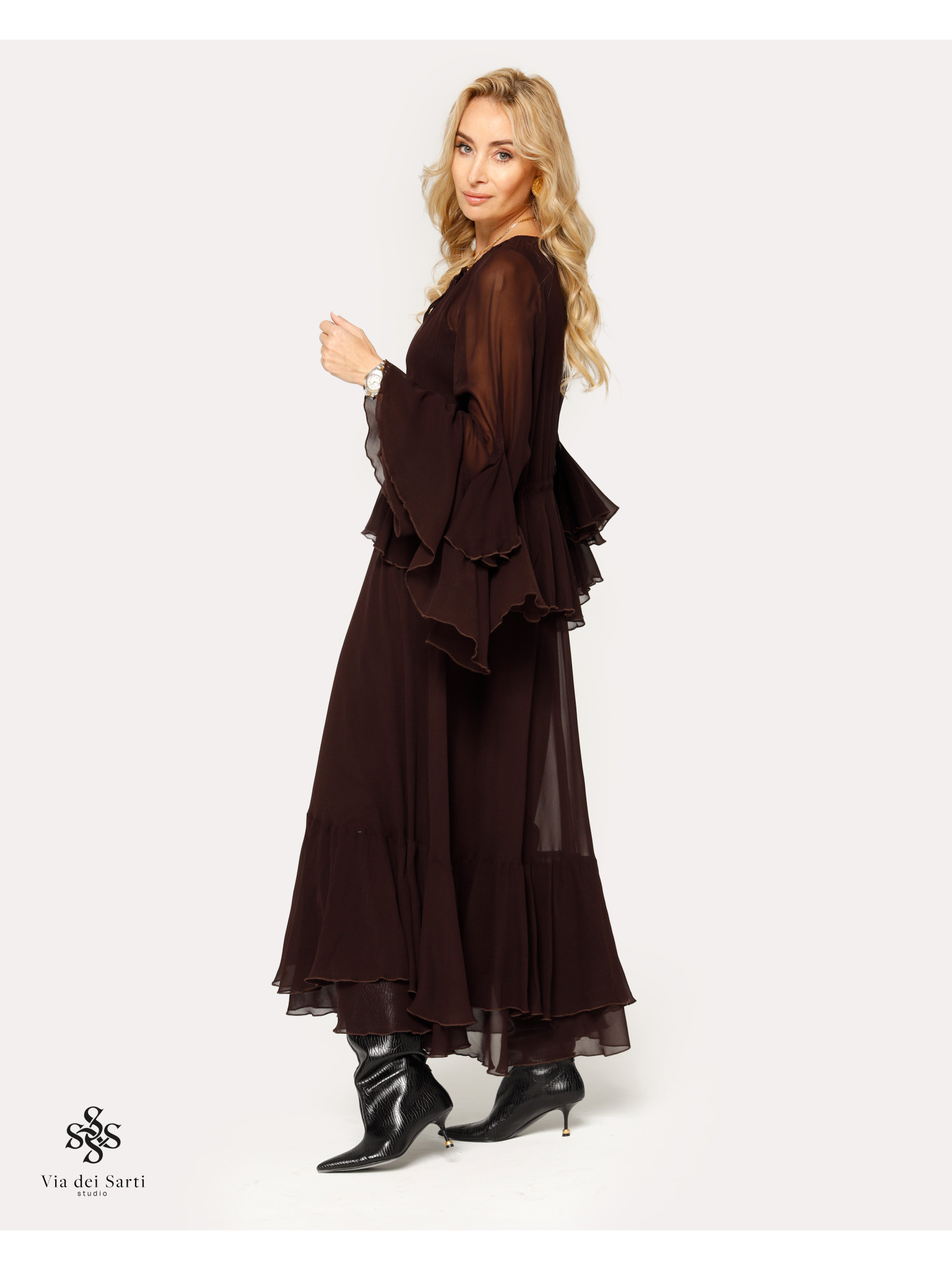 Ta sukienka to małe dzieło sztuki. Wykonana z lekko przeziernego jedwabiu w kolorze śliwkowego brązu, ozdobiona szytymi z koła falbanami nadającymi jej luksusowy sznyt i pięknie pracującymi w ruchu.