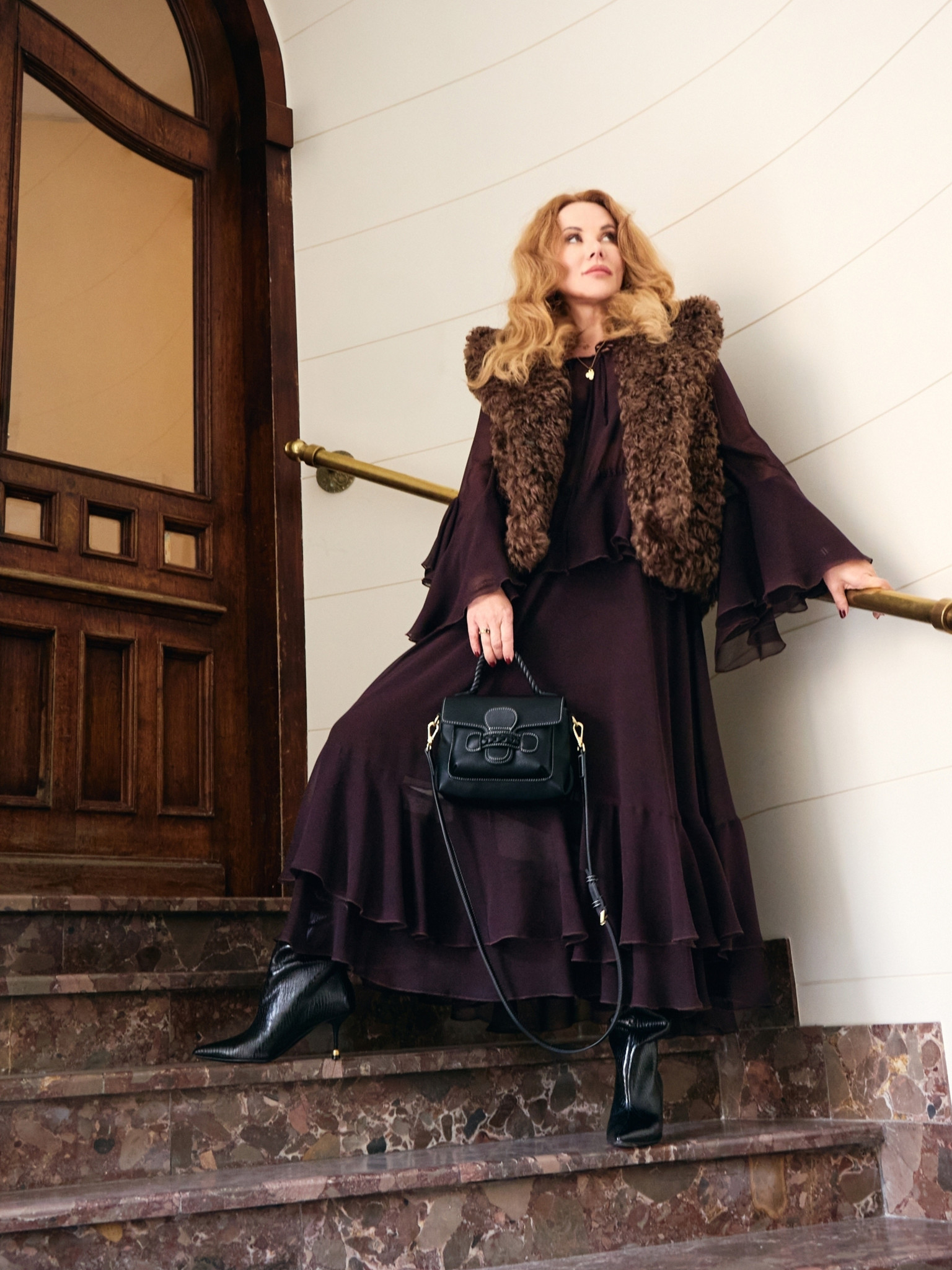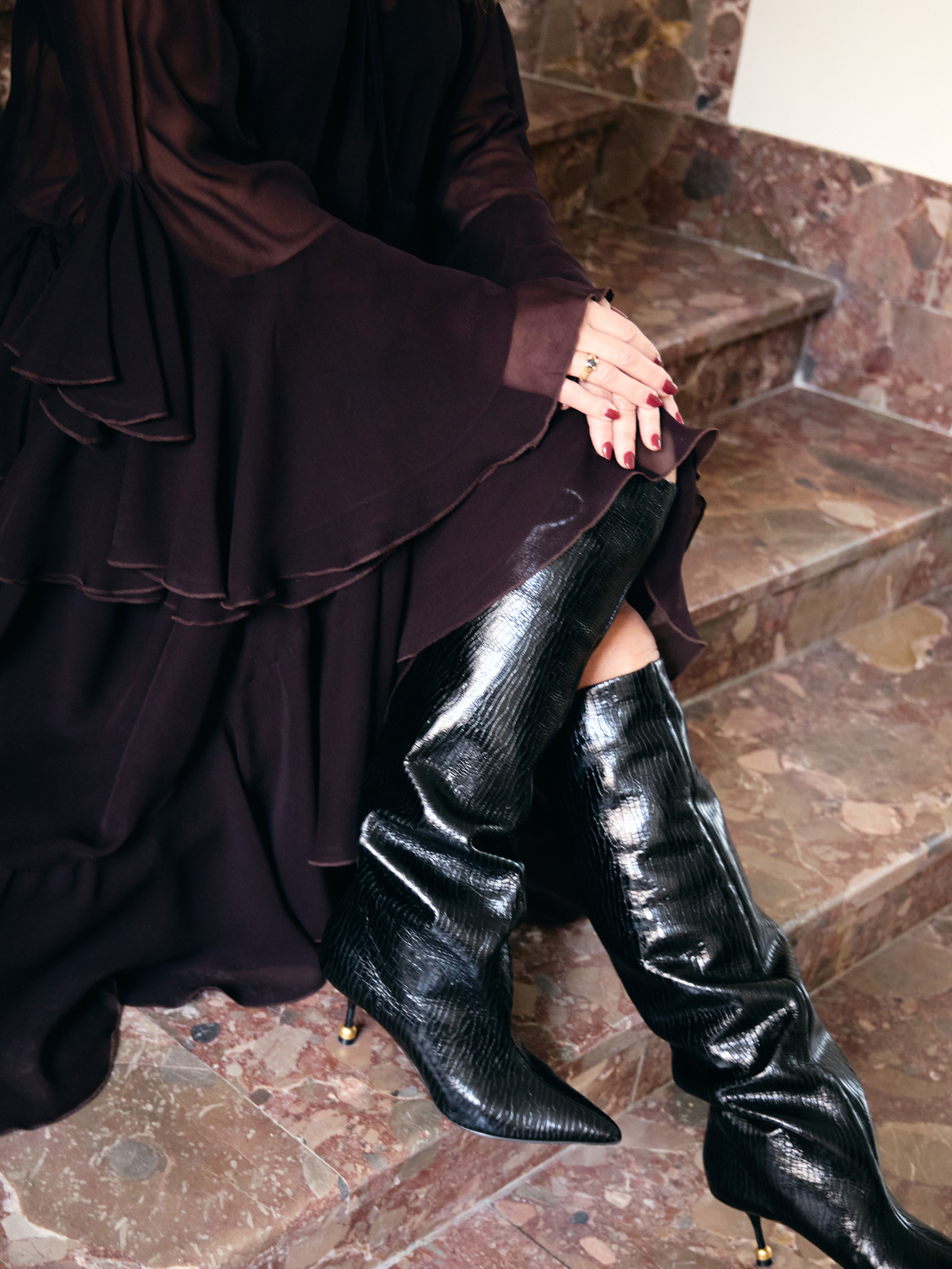 Ta sukienka to ma\u0142e dzie\u0142o sztuki. Wykonana z lekko przeziernego, luksusowego jedwabiu w kolorze \u015bliwkowego br\u0105zu, ozdobiona szytymi z ko\u0142a falbanami, kt\u00f3re pi\u0119knie uk\u0142adaj\u0105 si\u0119 w ruchu i nadaj\u0105 projektowi spektakularny wygl\u0105d.<\/p>\n
