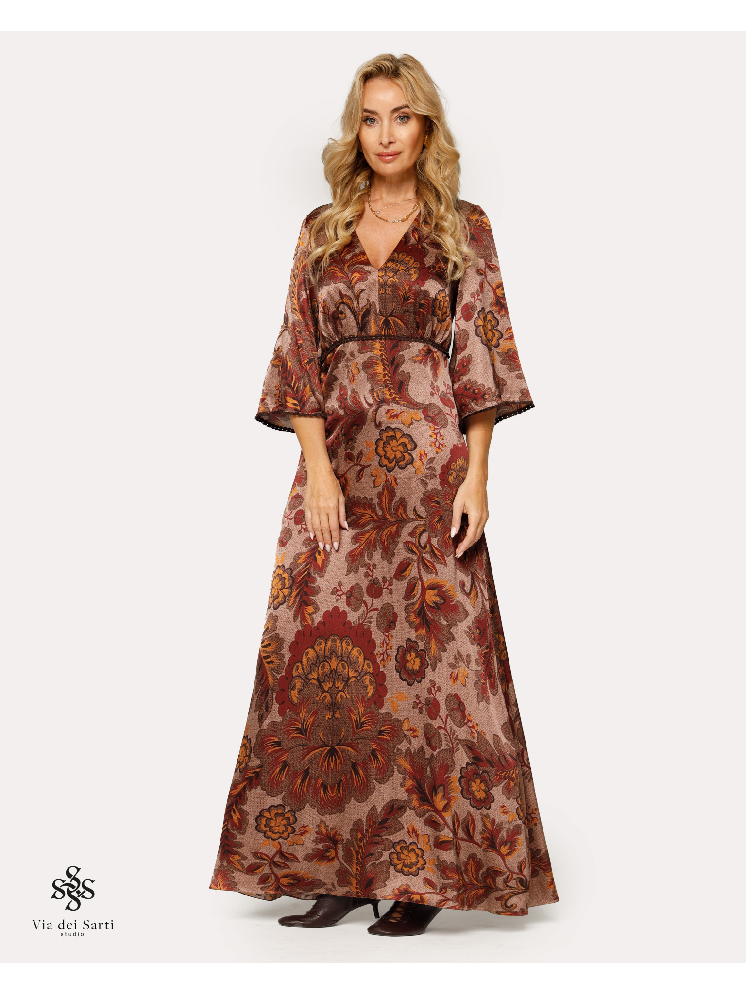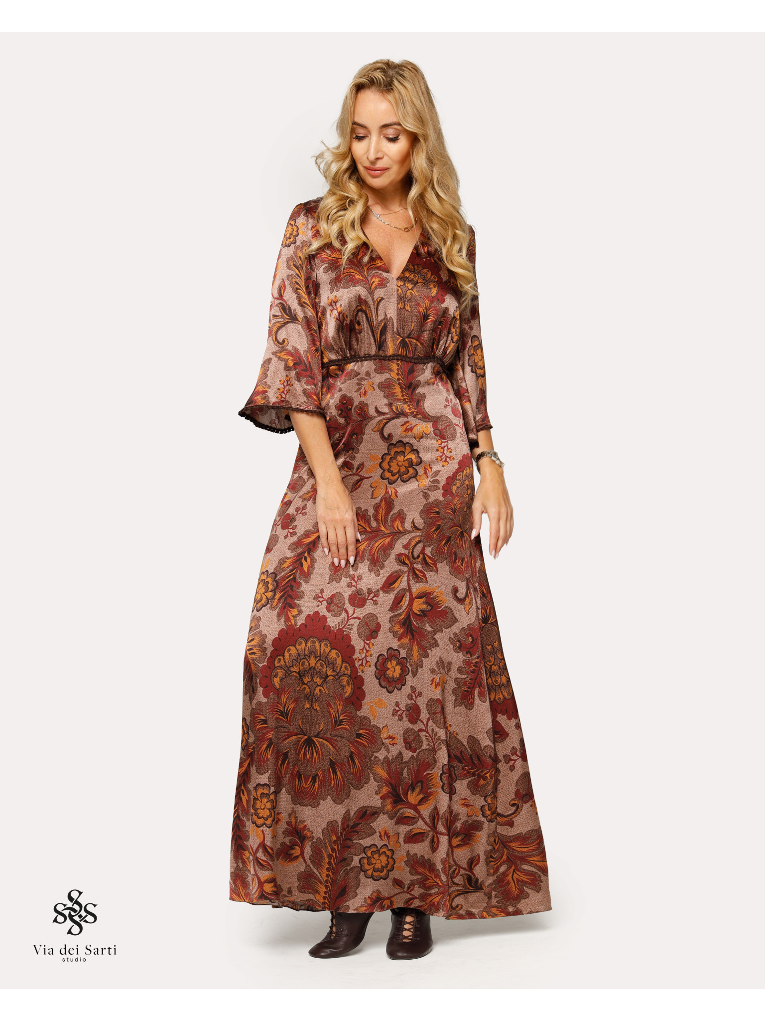 Sukienka z włoskiego jedwabiu we wzór zaprojektowany przez nas, utrzymany w pięknej zimowej stylistyce. Kojarzy się z filiżanką gorącej czekolady w chłodne, zimowe popołudnie.